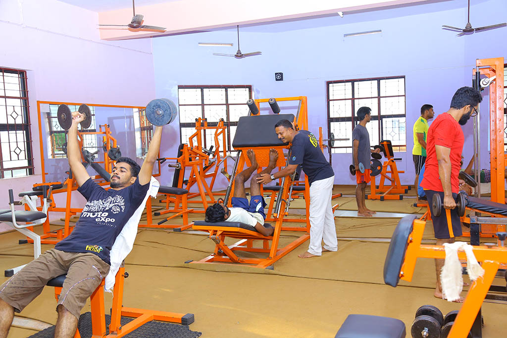 The college has got a well-equipped gymnasium to cater to the mental and physical well-being of the students. To maintain a healthy mind, it is essential to maintain a healthy body. Students are encouraged to do regular exercise in order to keep themselves fit and healthy. It is indeed a stress reliever for the students and helps them to keep away from the modern life style diseases like diabetes and cancer. The gym trainer Mr. Lohidakshan has several years of experience in managing gym and he has introduced world class cutting edge equipment so as to enable the students and faculty members to get the best health and fitness benefits. In addition to Mr.Lohidakshan, we also have esteemed Physical Education Director, Mr.Jyothish who is unscrupulously engaged in getting the students in good shape by advocating physical training sessions of high caliber to add on to the day to day monotonous classroom sessions, so as to improve the physical and mental aptitude to keep track of the massive knowledge absorption process in the classrooms.