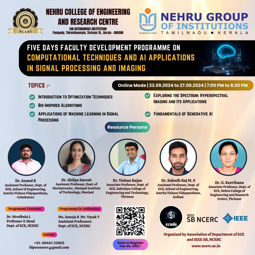 The Department of Electronics and Communication Engineering, in association with IEEE SB, NCERC, successfully conducted a Five-Day Faculty Development Programme (FDP) on Computational Techniques and AI Applications in Signal Processing and Imaging from September 23 to 27, 2024. The sessions were held online from 7:00 PM to 8:30 PM, providing an engaging and interactive learning experience.