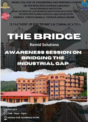 An awareness session on âBridging the Industrial Gapâ was organized by the Department of Electronics and Communication Engineering to help students understand industry expectations and essential professional skills. Conducted in collaboration with Romid Solutions, the interactive session provided insights into current industrial trends, technical competencies, and soft skills required for career readiness. The event, coordinated by Arjun and team, concluded with an encouraging note from the Head of the Department, motivating students to become industry-ready professionals.