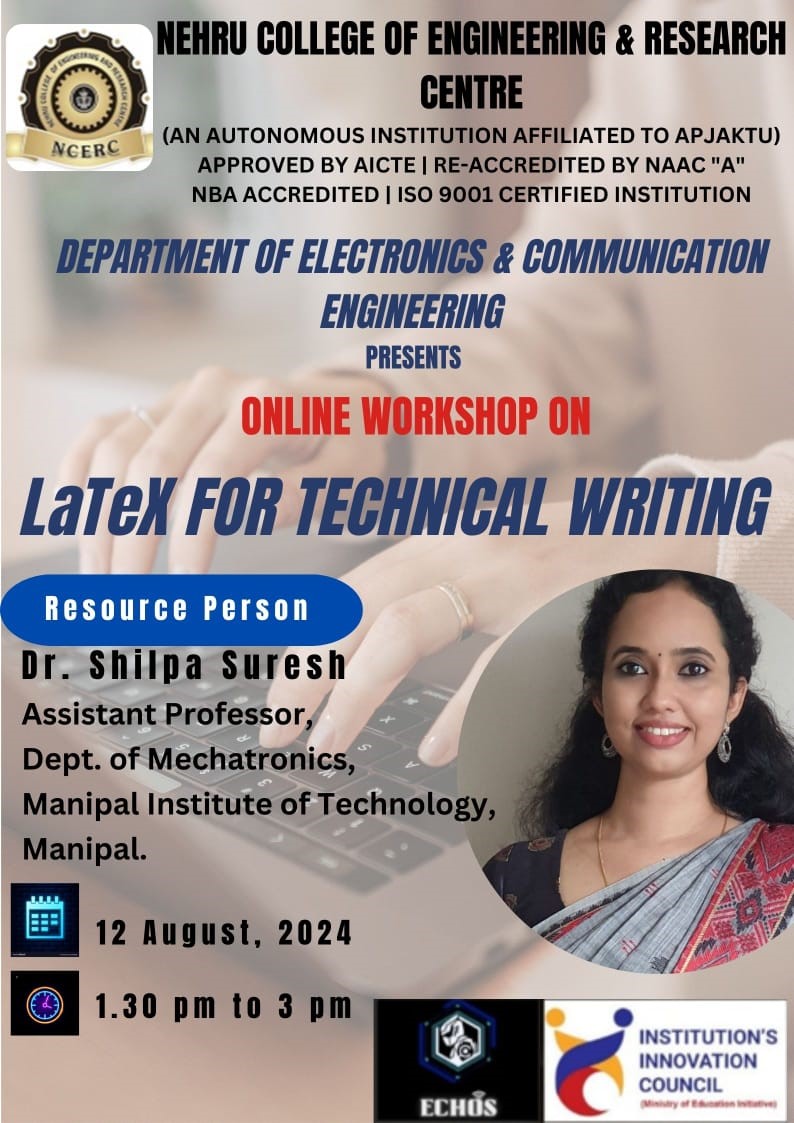 An online workshop on âLaTeX for technical writingâ was conducted by Association of the Department of ECE ECHOS on 12/08/24 for S7 ECE students to provide them with a comprehensive introduction to LaTeX, a powerful typesetting system widely used for technical and scientific documentation. The Session was handled by resource person Dr. Shilpa Suresh, Assistant Professor, Department of Mechatronics, Manipal Institute of Technology. The workshop focused on document creation, inserting images, equations, figures and tables, and managing bibliographies and citations. It proved to be highly useful, successfully equipping students with essential LaTeX skills for creating professional technical documents. The session was co-ordinated by Dr. Mredhula L, HoD, Department of ECE and ECHOS Faculty coordinator Dr. Keerthana G.
