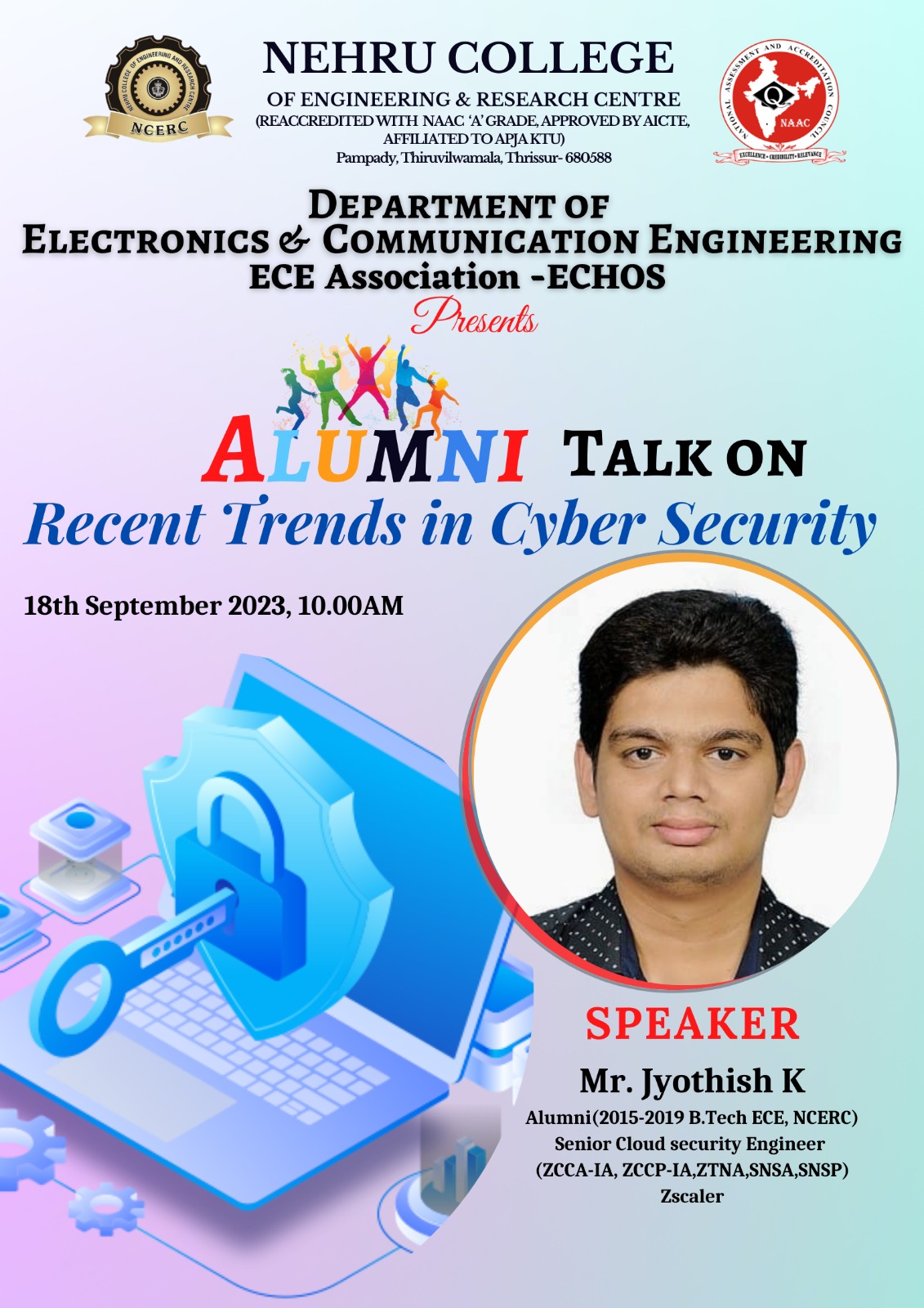 An alumini talk was organized by the association of the Department of Electronics & Communication Engineering - ECHOS on 18 th September, 2023 at the Aryabhatta Seminar Hall for the ECE students. The session was headed by our alumni of 2015-2019 batch, B. Tech ECE, NCERC, Mr. Jyotish K, who is currently working as the Senior Cloud Security Manager (ZCCA-IA, ZCCP-IA, ZTNA, SNSA, SNSP), Zscaler. The talk was about âRecent Trends in Cyber Securityâ in which he gave an overview of the concept, shared about the job opportunities in the field of âCyber Securityâ and cleared the doubts of the students related to that field. He also made us familiar with the depth of an interview, what all stages are included, what are the basic questions that we, the students as freshers must be familiar with and much more. The session was interactive and much educative. Later the session was concluded with a vote of thanks by Ms. Sajitha A S, Asst. Professor, Dept. of ECE.