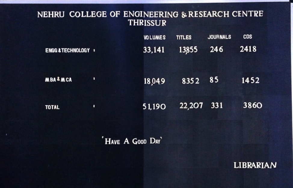 E-Learning Resources, like EBSCO and J-Gate are available in the Library, which is being effectively used by the Faculty and Students. There is a well-equipped Digital Library available in the Institute. The entire library is fully automated by software called KOHA LIBRARY SOFTWARE. The NCERC library is well stacked with 28309 textbooks related to various aspects of engineering and technology; industry related topics, general books and 4576 reference books are also available. The library is constantly updated with the latest Magazines, National & International journals, Reference books and other material at regular periods. The library also owns its digital set up with 64Mbps speed to access e-journals, e-books and other online resources like DELNET, Shodhganga & ShodhSindhu. The library has core reference collection of McGraw Hill, Springer and Elsevier, chronicle, cengage learning is also available for all students to upgrade their knowledge. To inspire the significance among the students concerning current affairs and general knowledge, study materials related to GATE and competitive examinations is available in the college library. DELNET is very helpful to access rare books from various institutions libraries. Manuscripts from various departments are available in our library for student reference.2415 educational videos are available in the digital library