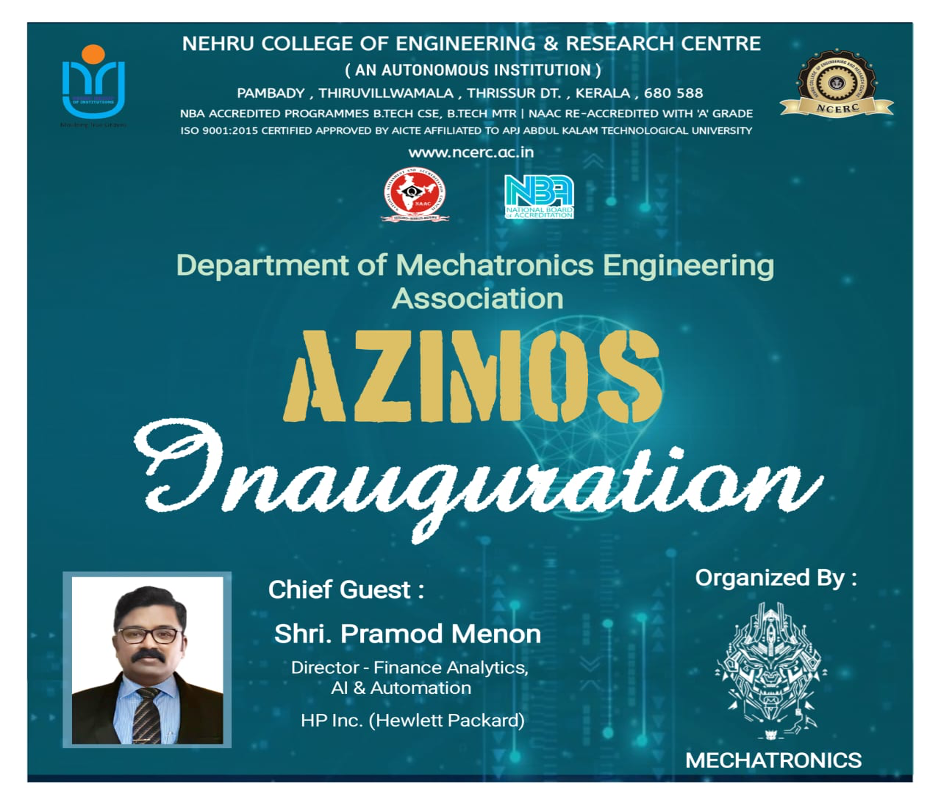 On October 20, 2023, the mechatronics department association AZIMOS was inaugurated. Mr. Pramod Menon, Director of HP Inc.'s Finance Analytics, AI, and Automation Division, was the main Guest. All of the students found his AI lesson to be highly informative. Additionally, the department has planned all of the association's events through 2023–24 Academic Year