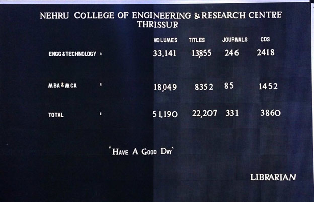 E-Learning Resources, like EBSCO and J-Gate are available in the Library, which is being effectively used by the Faculty and Students. There is a well-equipped Digital Library available in the Institute. The entire library is fully automated by software called KOHA LIBRARY SOFTWARE. The NCERC library is well stacked with 28309 textbooks related to various aspects of engineering and technology; industry related topics, general books and 4576 reference books are also available. The library is constantly updated with the latest Magazines, National & International journals, Reference books and other material at regular periods. The library also owns its digital set up with 64Mbps speed to access e-journals, e-books and other online resources like DELNET, Shodhganga & ShodhSindhu. The library has core reference collection of McGraw Hill, Springer and Elsevier, chronicle, cengage learning is also available for all students to upgrade their knowledge. To inspire the significance among the students concerning current affairs and general knowledge, study materials related to GATE and competitive examinations is available in the college library. DELNET is very helpful to access rare books from various institutions libraries. Manuscripts from various departments are available in our library for student reference.2415 educational videos are available in the digital library.